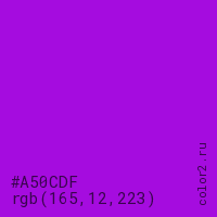 Цвет #A50CDF в цветовой модели RGB обозначается тремя октетами (165, 12, 223) в десятичном формате и #A50CDF в шестнадцатиричном (hex) формате, которые являются интенсивностью красного 165 (hex A5), интенсивность зелёного 12 (hex 0C) и интенсивность синего 223 (hex DF).
