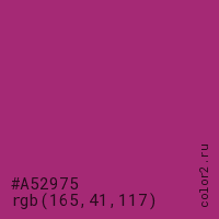 Цвет #A52975 в цветовой модели RGB обозначается тремя октетами (165, 41, 117) в десятичном формате и #A52975 в шестнадцатиричном (hex) формате, которые являются интенсивностью красного 165 (hex A5), интенсивность зелёного 41 (hex 29) и интенсивность синего 117 (hex 75).