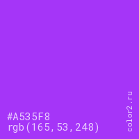 Цвет #A535F8 в цветовой модели RGB обозначается тремя октетами (165, 53, 248) в десятичном формате и #A535F8 в шестнадцатиричном (hex) формате, которые являются интенсивностью красного 165 (hex A5), интенсивность зелёного 53 (hex 35) и интенсивность синего 248 (hex F8).
