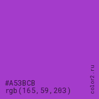 Цвет #A53BCB в цветовой модели RGB обозначается тремя октетами (165, 59, 203) в десятичном формате и #A53BCB в шестнадцатиричном (hex) формате, которые являются интенсивностью красного 165 (hex A5), интенсивность зелёного 59 (hex 3B) и интенсивность синего 203 (hex CB).