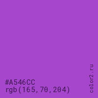 Цвет #A546CC в цветовой модели RGB обозначается тремя октетами (165, 70, 204) в десятичном формате и #A546CC в шестнадцатиричном (hex) формате, которые являются интенсивностью красного 165 (hex A5), интенсивность зелёного 70 (hex 46) и интенсивность синего 204 (hex CC).