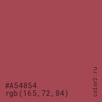 Цвет #A54854 в цветовой модели RGB обозначается тремя октетами (165, 72, 84) в десятичном формате и #A54854 в шестнадцатиричном (hex) формате, которые являются интенсивностью красного 165 (hex A5), интенсивность зелёного 72 (hex 48) и интенсивность синего 84 (hex 54).