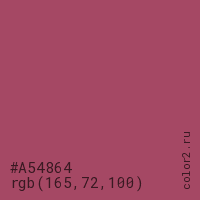Цвет #A54864 в цветовой модели RGB обозначается тремя октетами (165, 72, 100) в десятичном формате и #A54864 в шестнадцатиричном (hex) формате, которые являются интенсивностью красного 165 (hex A5), интенсивность зелёного 72 (hex 48) и интенсивность синего 100 (hex 64).