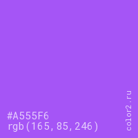 Цвет #A555F6 в цветовой модели RGB обозначается тремя октетами (165, 85, 246) в десятичном формате и #A555F6 в шестнадцатиричном (hex) формате, которые являются интенсивностью красного 165 (hex A5), интенсивность зелёного 85 (hex 55) и интенсивность синего 246 (hex F6).