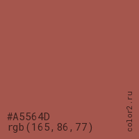 Цвет #A5564D в цветовой модели RGB обозначается тремя октетами (165, 86, 77) в десятичном формате и #A5564D в шестнадцатиричном (hex) формате, которые являются интенсивностью красного 165 (hex A5), интенсивность зелёного 86 (hex 56) и интенсивность синего 77 (hex 4D).