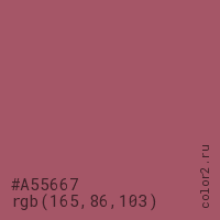 Цвет #A55667 в цветовой модели RGB обозначается тремя октетами (165, 86, 103) в десятичном формате и #A55667 в шестнадцатиричном (hex) формате, которые являются интенсивностью красного 165 (hex A5), интенсивность зелёного 86 (hex 56) и интенсивность синего 103 (hex 67).