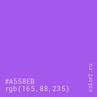 Цвет #A558EB в цветовой модели RGB обозначается тремя октетами (165, 88, 235) в десятичном формате и #A558EB в шестнадцатиричном (hex) формате, которые являются интенсивностью красного 165 (hex A5), интенсивность зелёного 88 (hex 58) и интенсивность синего 235 (hex EB).