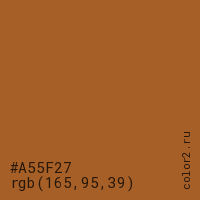 Цвет #A55F27 в цветовой модели RGB обозначается тремя октетами (165, 95, 39) в десятичном формате и #A55F27 в шестнадцатиричном (hex) формате, которые являются интенсивностью красного 165 (hex A5), интенсивность зелёного 95 (hex 5F) и интенсивность синего 39 (hex 27).
