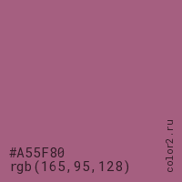 Цвет #A55F80 в цветовой модели RGB обозначается тремя октетами (165, 95, 128) в десятичном формате и #A55F80 в шестнадцатиричном (hex) формате, которые являются интенсивностью красного 165 (hex A5), интенсивность зелёного 95 (hex 5F) и интенсивность синего 128 (hex 80).