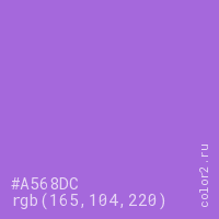 Цвет #A568DC в цветовой модели RGB обозначается тремя октетами (165, 104, 220) в десятичном формате и #A568DC в шестнадцатиричном (hex) формате, которые являются интенсивностью красного 165 (hex A5), интенсивность зелёного 104 (hex 68) и интенсивность синего 220 (hex DC).