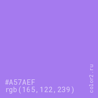 Цвет #A57AEF в цветовой модели RGB обозначается тремя октетами (165, 122, 239) в десятичном формате и #A57AEF в шестнадцатиричном (hex) формате, которые являются интенсивностью красного 165 (hex A5), интенсивность зелёного 122 (hex 7A) и интенсивность синего 239 (hex EF).