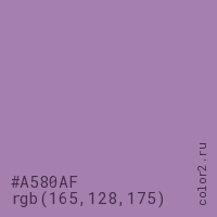 Цвет #A580AF в цветовой модели RGB обозначается тремя октетами (165, 128, 175) в десятичном формате и #A580AF в шестнадцатиричном (hex) формате, которые являются интенсивностью красного 165 (hex A5), интенсивность зелёного 128 (hex 80) и интенсивность синего 175 (hex AF).
