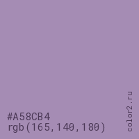 Цвет #A58CB4 в цветовой модели RGB обозначается тремя октетами (165, 140, 180) в десятичном формате и #A58CB4 в шестнадцатиричном (hex) формате, которые являются интенсивностью красного 165 (hex A5), интенсивность зелёного 140 (hex 8C) и интенсивность синего 180 (hex B4).