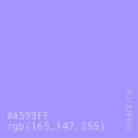 Цвет #A593FF в цветовой модели RGB обозначается тремя октетами (165, 147, 255) в десятичном формате и #A593FF в шестнадцатиричном (hex) формате, которые являются интенсивностью красного 165 (hex A5), интенсивность зелёного 147 (hex 93) и интенсивность синего 255 (hex FF).