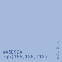 Цвет #A5B9DA в цветовой модели RGB обозначается тремя октетами (165, 185, 218) в десятичном формате и #A5B9DA в шестнадцатиричном (hex) формате, которые являются интенсивностью красного 165 (hex A5), интенсивность зелёного 185 (hex B9) и интенсивность синего 218 (hex DA).