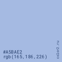 Цвет #A5BAE2 в цветовой модели RGB обозначается тремя октетами (165, 186, 226) в десятичном формате и #A5BAE2 в шестнадцатиричном (hex) формате, которые являются интенсивностью красного 165 (hex A5), интенсивность зелёного 186 (hex BA) и интенсивность синего 226 (hex E2).