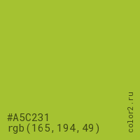 Цвет #A5C231 в цветовой модели RGB обозначается тремя октетами (165, 194, 49) в десятичном формате и #A5C231 в шестнадцатиричном (hex) формате, которые являются интенсивностью красного 165 (hex A5), интенсивность зелёного 194 (hex C2) и интенсивность синего 49 (hex 31).