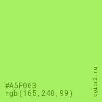Цвет #A5F063 в цветовой модели RGB обозначается тремя октетами (165, 240, 99) в десятичном формате и #A5F063 в шестнадцатиричном (hex) формате, которые являются интенсивностью красного 165 (hex A5), интенсивность зелёного 240 (hex F0) и интенсивность синего 99 (hex 63).