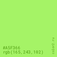 Цвет #A5F366 в цветовой модели RGB обозначается тремя октетами (165, 243, 102) в десятичном формате и #A5F366 в шестнадцатиричном (hex) формате, которые являются интенсивностью красного 165 (hex A5), интенсивность зелёного 243 (hex F3) и интенсивность синего 102 (hex 66).