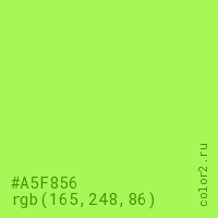 Цвет #A5F856 в цветовой модели RGB обозначается тремя октетами (165, 248, 86) в десятичном формате и #A5F856 в шестнадцатиричном (hex) формате, которые являются интенсивностью красного 165 (hex A5), интенсивность зелёного 248 (hex F8) и интенсивность синего 86 (hex 56).
