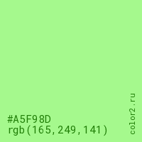 Цвет #A5F98D в цветовой модели RGB обозначается тремя октетами (165, 249, 141) в десятичном формате и #A5F98D в шестнадцатиричном (hex) формате, которые являются интенсивностью красного 165 (hex A5), интенсивность зелёного 249 (hex F9) и интенсивность синего 141 (hex 8D).