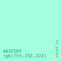 Цвет #A5FDDF в цветовой модели RGB обозначается тремя октетами (165, 253, 223) в десятичном формате и #A5FDDF в шестнадцатиричном (hex) формате, которые являются интенсивностью красного 165 (hex A5), интенсивность зелёного 253 (hex FD) и интенсивность синего 223 (hex DF).