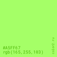 Цвет #A5FF67 в цветовой модели RGB обозначается тремя октетами (165, 255, 103) в десятичном формате и #A5FF67 в шестнадцатиричном (hex) формате, которые являются интенсивностью красного 165 (hex A5), интенсивность зелёного 255 (hex FF) и интенсивность синего 103 (hex 67).