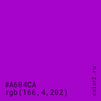 Цвет #A604CA в цветовой модели RGB обозначается тремя октетами (166, 4, 202) в десятичном формате и #A604CA в шестнадцатиричном (hex) формате, которые являются интенсивностью красного 166 (hex A6), интенсивность зелёного 4 (hex 04) и интенсивность синего 202 (hex CA).