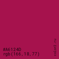 Цвет #A6124D в цветовой модели RGB обозначается тремя октетами (166, 18, 77) в десятичном формате и #A6124D в шестнадцатиричном (hex) формате, которые являются интенсивностью красного 166 (hex A6), интенсивность зелёного 18 (hex 12) и интенсивность синего 77 (hex 4D).