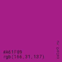 Цвет #A61F89 в цветовой модели RGB обозначается тремя октетами (166, 31, 137) в десятичном формате и #A61F89 в шестнадцатиричном (hex) формате, которые являются интенсивностью красного 166 (hex A6), интенсивность зелёного 31 (hex 1F) и интенсивность синего 137 (hex 89).