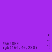Цвет #A628EE в цветовой модели RGB обозначается тремя октетами (166, 40, 238) в десятичном формате и #A628EE в шестнадцатиричном (hex) формате, которые являются интенсивностью красного 166 (hex A6), интенсивность зелёного 40 (hex 28) и интенсивность синего 238 (hex EE).