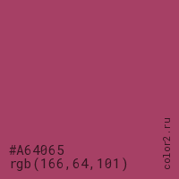 Цвет #A64065 в цветовой модели RGB обозначается тремя октетами (166, 64, 101) в десятичном формате и #A64065 в шестнадцатиричном (hex) формате, которые являются интенсивностью красного 166 (hex A6), интенсивность зелёного 64 (hex 40) и интенсивность синего 101 (hex 65).