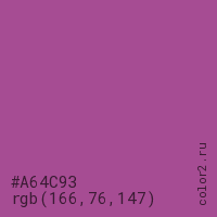 Цвет #A64C93 в цветовой модели RGB обозначается тремя октетами (166, 76, 147) в десятичном формате и #A64C93 в шестнадцатиричном (hex) формате, которые являются интенсивностью красного 166 (hex A6), интенсивность зелёного 76 (hex 4C) и интенсивность синего 147 (hex 93).