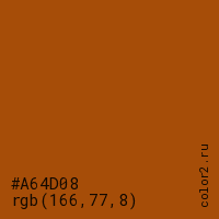 Цвет #A64D08 в цветовой модели RGB обозначается тремя октетами (166, 77, 8) в десятичном формате и #A64D08 в шестнадцатиричном (hex) формате, которые являются интенсивностью красного 166 (hex A6), интенсивность зелёного 77 (hex 4D) и интенсивность синего 8 (hex 08).