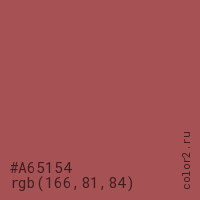 Цвет #A65154 в цветовой модели RGB обозначается тремя октетами (166, 81, 84) в десятичном формате и #A65154 в шестнадцатиричном (hex) формате, которые являются интенсивностью красного 166 (hex A6), интенсивность зелёного 81 (hex 51) и интенсивность синего 84 (hex 54).