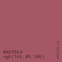 Цвет #A65964 в цветовой модели RGB обозначается тремя октетами (166, 89, 100) в десятичном формате и #A65964 в шестнадцатиричном (hex) формате, которые являются интенсивностью красного 166 (hex A6), интенсивность зелёного 89 (hex 59) и интенсивность синего 100 (hex 64).