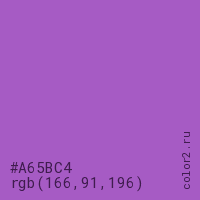Цвет #A65BC4 в цветовой модели RGB обозначается тремя октетами (166, 91, 196) в десятичном формате и #A65BC4 в шестнадцатиричном (hex) формате, которые являются интенсивностью красного 166 (hex A6), интенсивность зелёного 91 (hex 5B) и интенсивность синего 196 (hex C4).