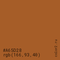 Цвет #A65D28 в цветовой модели RGB обозначается тремя октетами (166, 93, 40) в десятичном формате и #A65D28 в шестнадцатиричном (hex) формате, которые являются интенсивностью красного 166 (hex A6), интенсивность зелёного 93 (hex 5D) и интенсивность синего 40 (hex 28).