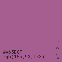 Цвет #A65D8F в цветовой модели RGB обозначается тремя октетами (166, 93, 143) в десятичном формате и #A65D8F в шестнадцатиричном (hex) формате, которые являются интенсивностью красного 166 (hex A6), интенсивность зелёного 93 (hex 5D) и интенсивность синего 143 (hex 8F).