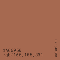 Цвет #A66950 в цветовой модели RGB обозначается тремя октетами (166, 105, 80) в десятичном формате и #A66950 в шестнадцатиричном (hex) формате, которые являются интенсивностью красного 166 (hex A6), интенсивность зелёного 105 (hex 69) и интенсивность синего 80 (hex 50).