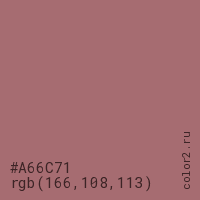 Цвет #A66C71 в цветовой модели RGB обозначается тремя октетами (166, 108, 113) в десятичном формате и #A66C71 в шестнадцатиричном (hex) формате, которые являются интенсивностью красного 166 (hex A6), интенсивность зелёного 108 (hex 6C) и интенсивность синего 113 (hex 71).