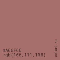 Цвет #A66F6C в цветовой модели RGB обозначается тремя октетами (166, 111, 108) в десятичном формате и #A66F6C в шестнадцатиричном (hex) формате, которые являются интенсивностью красного 166 (hex A6), интенсивность зелёного 111 (hex 6F) и интенсивность синего 108 (hex 6C).
