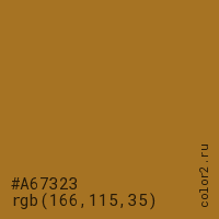 Цвет #A67323 в цветовой модели RGB обозначается тремя октетами (166, 115, 35) в десятичном формате и #A67323 в шестнадцатиричном (hex) формате, которые являются интенсивностью красного 166 (hex A6), интенсивность зелёного 115 (hex 73) и интенсивность синего 35 (hex 23).