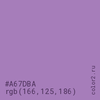Цвет #A67DBA в цветовой модели RGB обозначается тремя октетами (166, 125, 186) в десятичном формате и #A67DBA в шестнадцатиричном (hex) формате, которые являются интенсивностью красного 166 (hex A6), интенсивность зелёного 125 (hex 7D) и интенсивность синего 186 (hex BA).