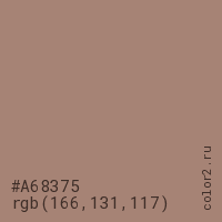 Цвет #A68375 в цветовой модели RGB обозначается тремя октетами (166, 131, 117) в десятичном формате и #A68375 в шестнадцатиричном (hex) формате, которые являются интенсивностью красного 166 (hex A6), интенсивность зелёного 131 (hex 83) и интенсивность синего 117 (hex 75).