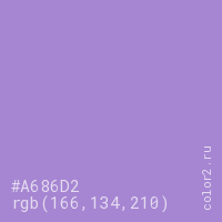 Цвет #A686D2 в цветовой модели RGB обозначается тремя октетами (166, 134, 210) в десятичном формате и #A686D2 в шестнадцатиричном (hex) формате, которые являются интенсивностью красного 166 (hex A6), интенсивность зелёного 134 (hex 86) и интенсивность синего 210 (hex D2).