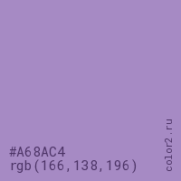 Цвет #A68AC4 в цветовой модели RGB обозначается тремя октетами (166, 138, 196) в десятичном формате и #A68AC4 в шестнадцатиричном (hex) формате, которые являются интенсивностью красного 166 (hex A6), интенсивность зелёного 138 (hex 8A) и интенсивность синего 196 (hex C4).