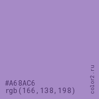 Цвет #A68AC6 в цветовой модели RGB обозначается тремя октетами (166, 138, 198) в десятичном формате и #A68AC6 в шестнадцатиричном (hex) формате, которые являются интенсивностью красного 166 (hex A6), интенсивность зелёного 138 (hex 8A) и интенсивность синего 198 (hex C6).