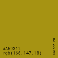Цвет #A69312 в цветовой модели RGB обозначается тремя октетами (166, 147, 18) в десятичном формате и #A69312 в шестнадцатиричном (hex) формате, которые являются интенсивностью красного 166 (hex A6), интенсивность зелёного 147 (hex 93) и интенсивность синего 18 (hex 12).