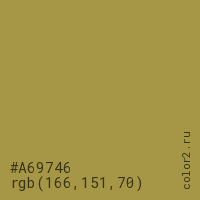 Цвет #A69746 в цветовой модели RGB обозначается тремя октетами (166, 151, 70) в десятичном формате и #A69746 в шестнадцатиричном (hex) формате, которые являются интенсивностью красного 166 (hex A6), интенсивность зелёного 151 (hex 97) и интенсивность синего 70 (hex 46).